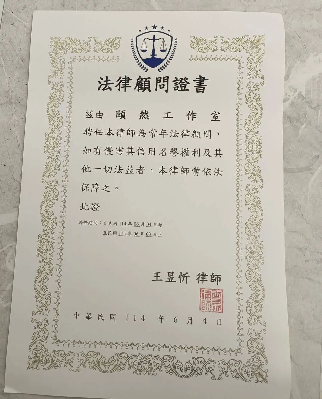 感謝 頤然工作室 聘請本律師為法律顧問~歡迎有法律顧問需求的企業+line洽詢❗ 遇到任何法律問題歡迎加王律師的LINE,王律師協助您爭取最大權益!
