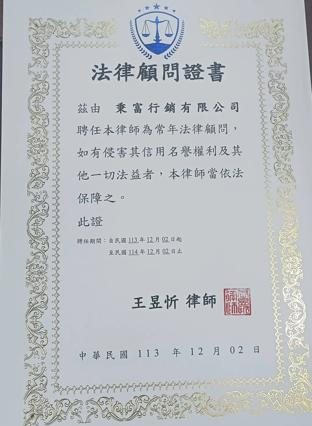 感謝秉富行銷公司聘請本律師為法律顧問~歡迎有法律顧問需求的企業+line洽詢❗ 遇到任何法律問題歡迎加王律師的LINE,王律師協助您爭取最大權益!