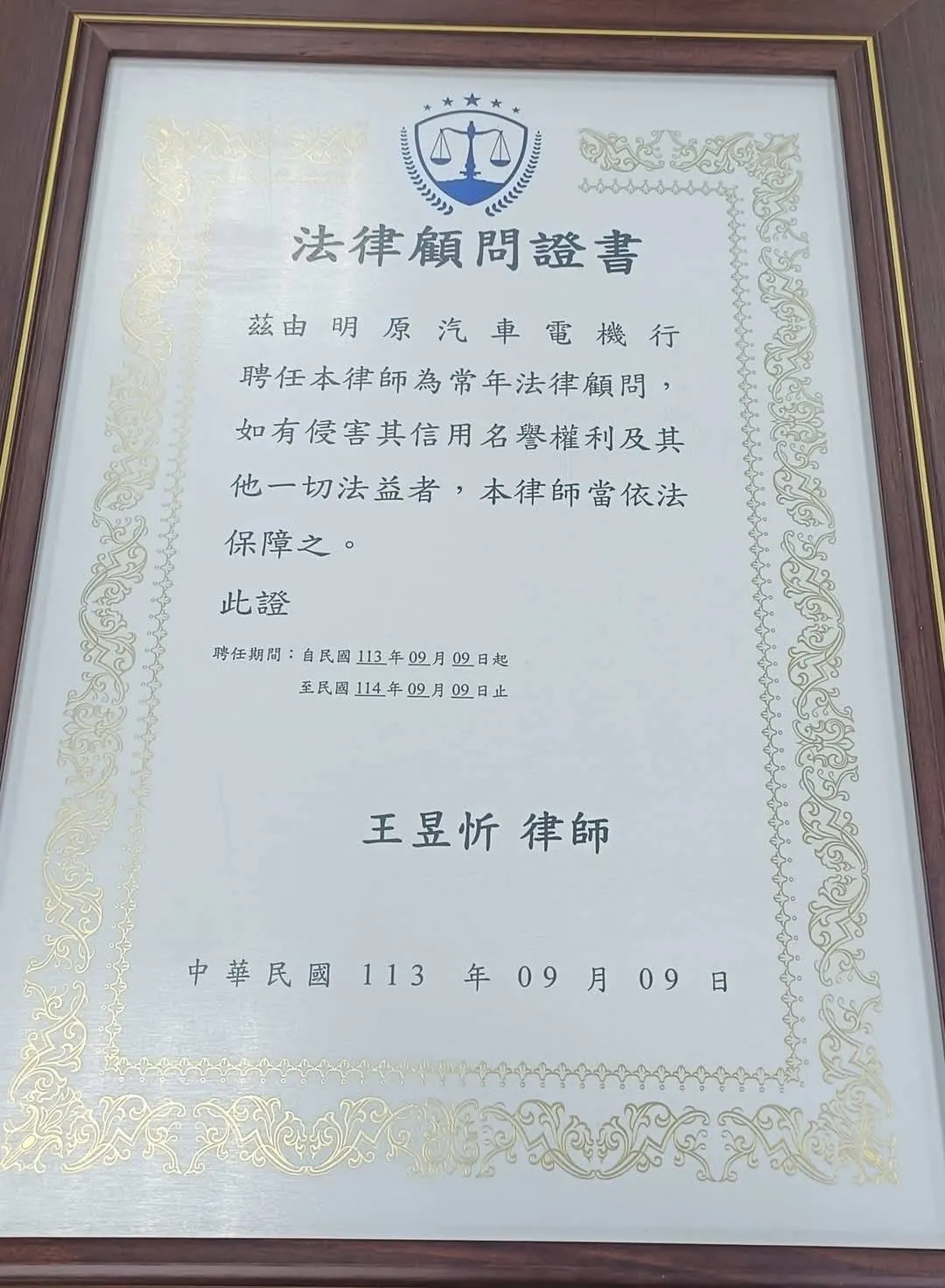 感謝明原汽車電機行聘請本律師為法律顧問,王律師對待每一個客戶都是十分用心的~ 遇到任何法律問題歡迎加王律師的LINE,王律師協助您爭取最大權益!